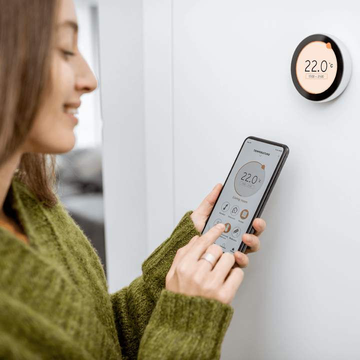 A smart thermostat connects to the internet, allowing remote control of heating via a smartphone or computer. Advanced models learn household patterns over time, automatically adjusting temperatures to reduce energy wastage.